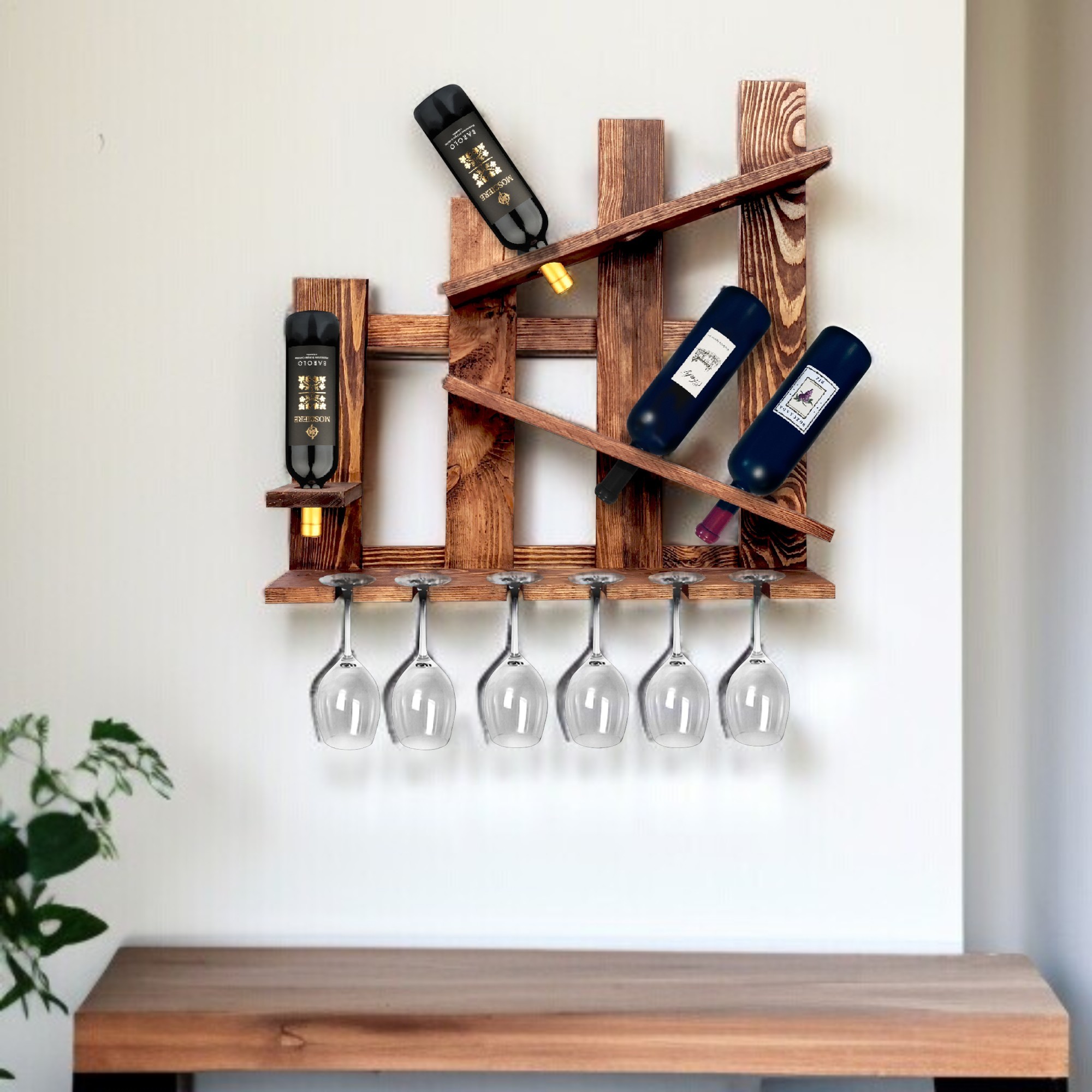Rustik Ahşap Duvar Şaraplık – 7 Şişe & 6 Kadeh Kapasiteli